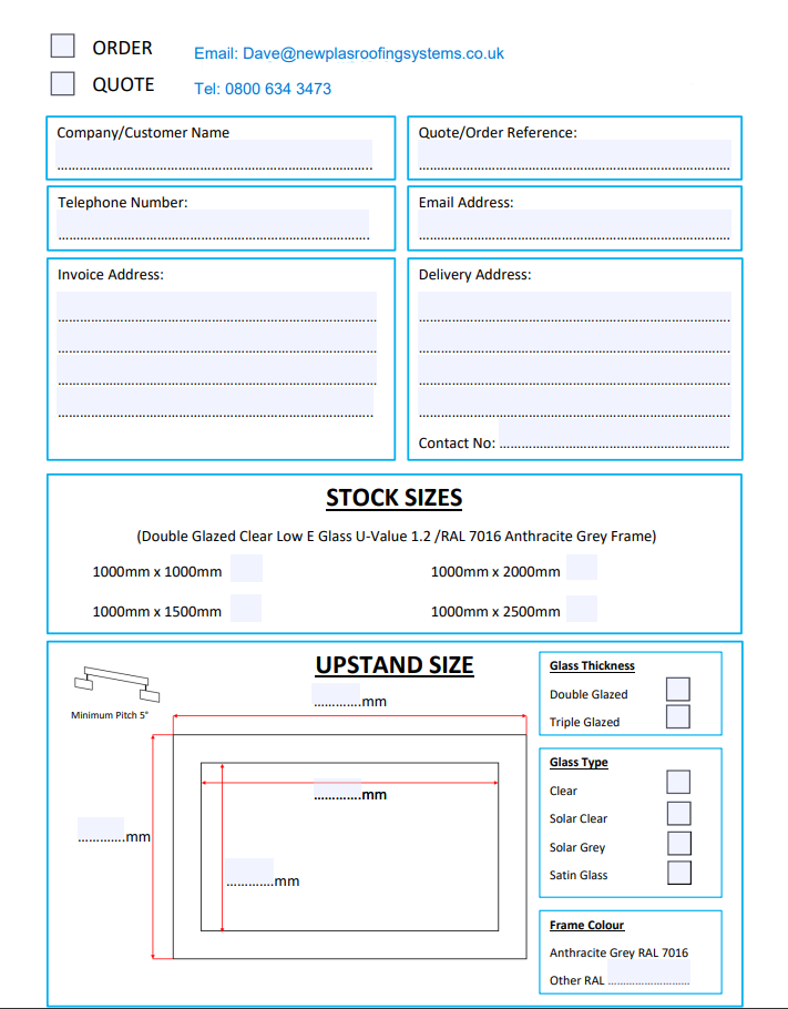 Download and return the Flat Rooflight form below to dave@newplasroofingsystems.co.uk