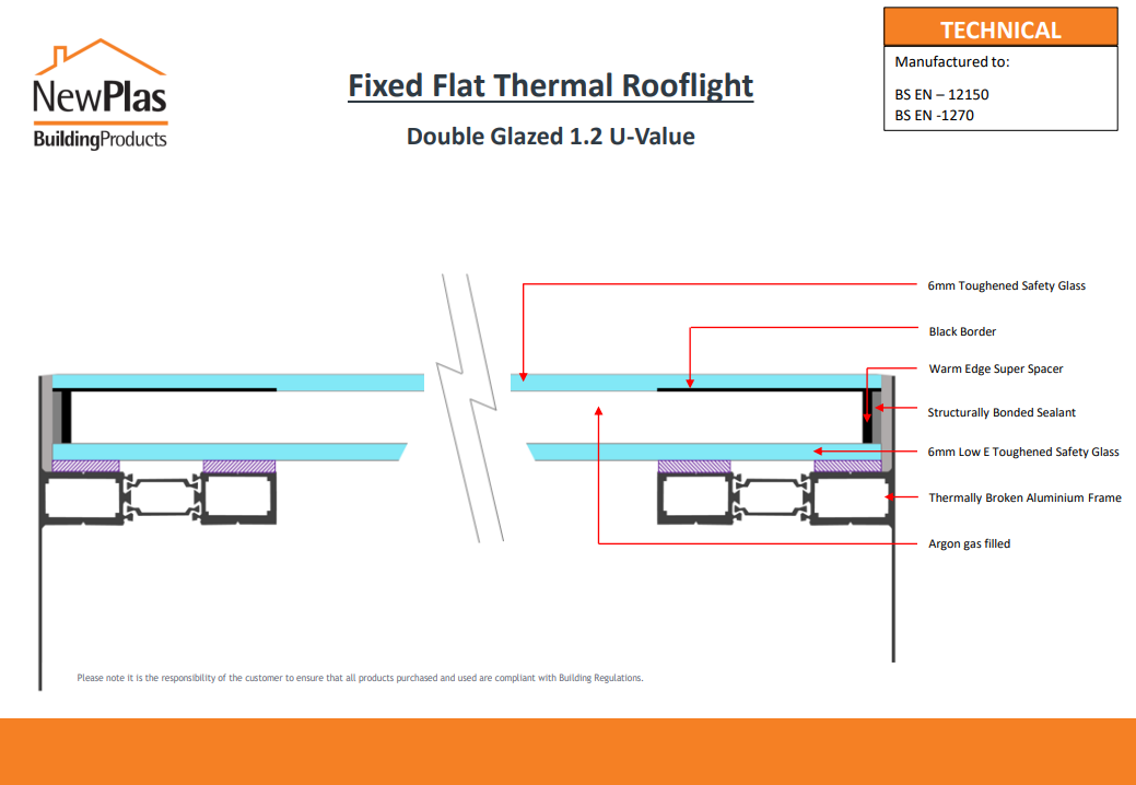 The high quality flat fixed rooflights we offer feature Clear Toughened Safety Glass, with a U-Value of 1.2 w/m2. The roof window glass is glazed into an Anthracite Grey (RAL 7016) powder coated aluminium frame that is thermally broken.